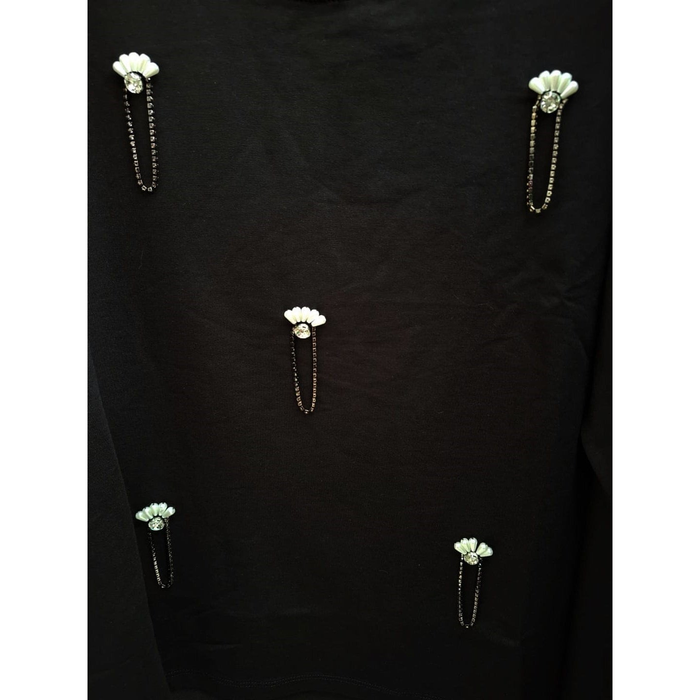 Bluza are o croială lejeră, cu mâneci trei sferturi și un design minimalist. Detaliile aplicate în forme abstracte, din elemente decorative argintii, adaugă un plus de rafinament și transformă piesa într-un accent vizual modern. Materialul este fluid și se așază elegant pe corp.