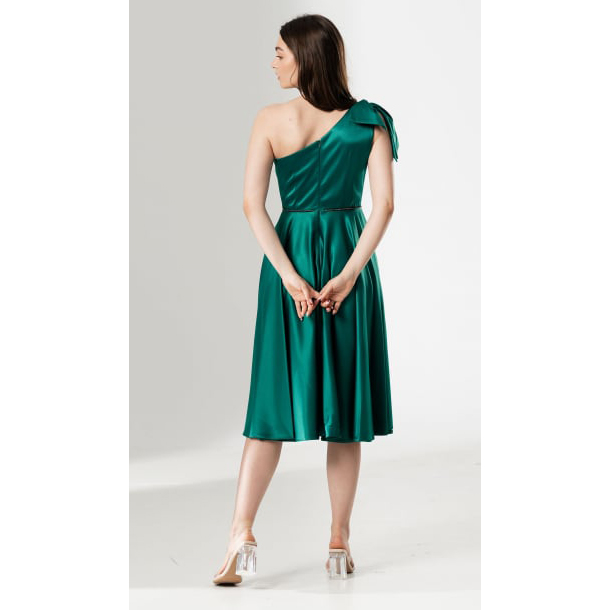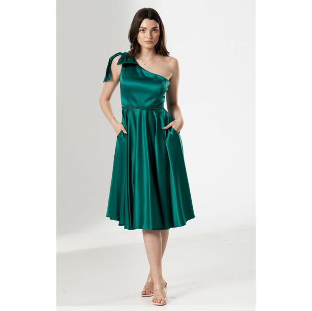 Această rochie midi, cu croială cloș, este alegerea perfectă pentru evenimente în care vrei să strălucești prin rafinament și culoare. Confecționată din satin lucios, rochia pune în valoare silueta datorită designului cu o bretea și a bustului bine structurat, oferind un look feminin și modern.