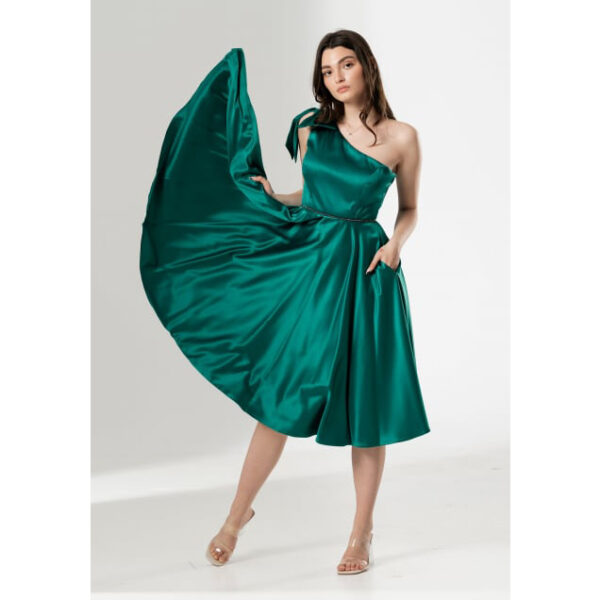 Talia este accentuată discret, iar fusta amplă tip cloș cade frumos, creând mișcare și volum la fiecare pas. Nuanța vibrantă de verde adaugă un plus de energie și eleganță ținutei, transformând-o în piesa principală a oricărui eveniment.