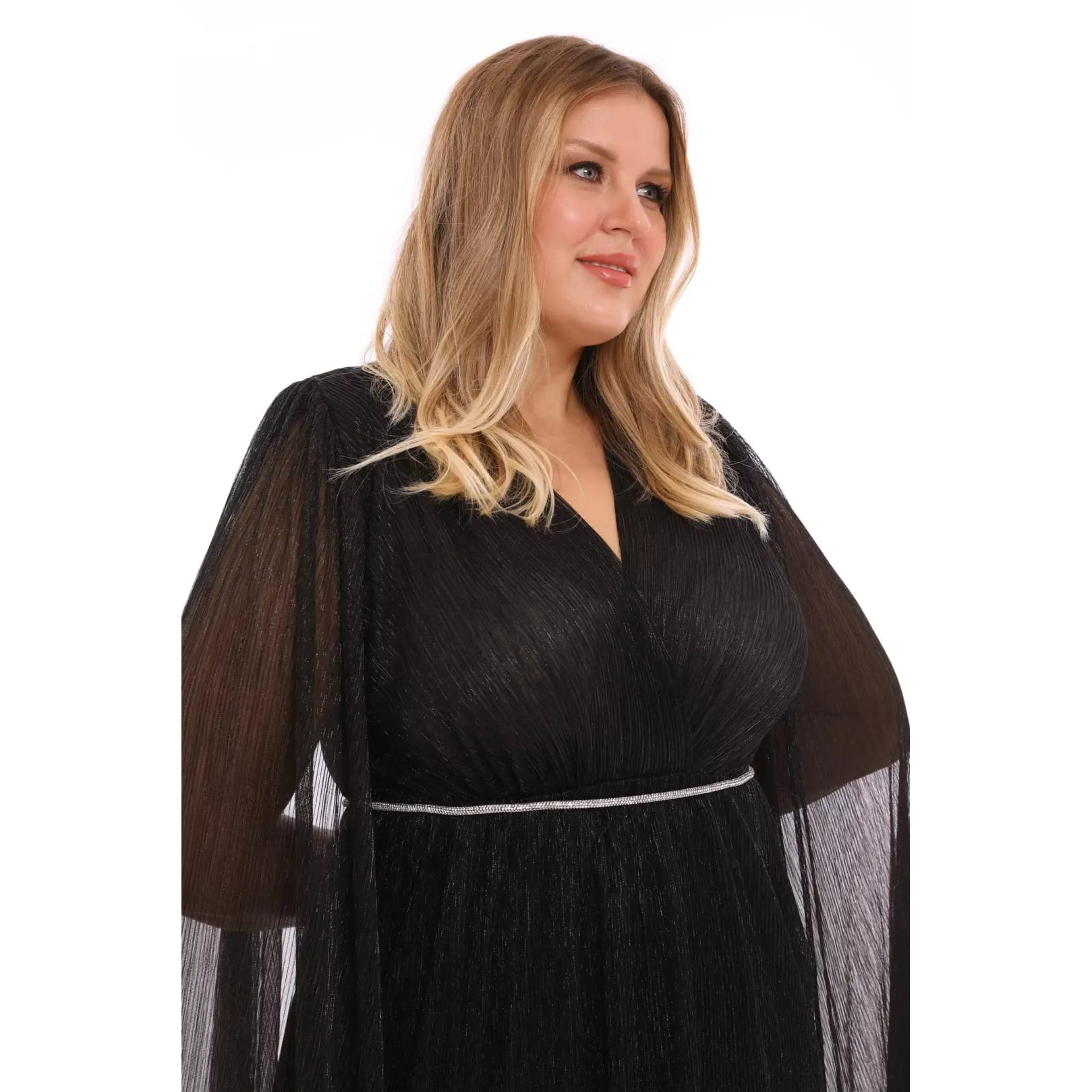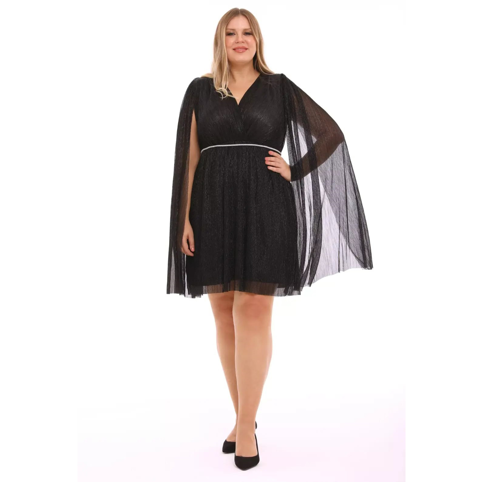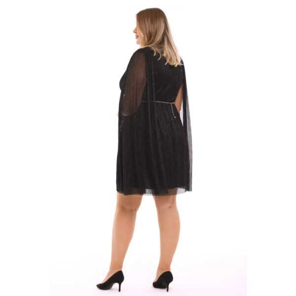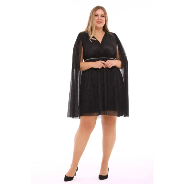 Realizată dintr-un material fin cu efect discret strălucitor, rochia este completată de inserții vaporoase din voal care cad delicat peste brațe, adăugând un aer sofisticat și modern. Decolteul în formă de „V” alungește silueta, iar lungimea deasupra genunchiului conferă un look seducător, dar stilat.
